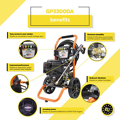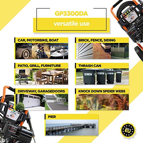 ✦ CALIDAD PARA DURAR: Hecho para durar al menos 5 años más que cualquier hidrolimpiadora a presión eléctrica. Lo que significa menos tiempo invertido en reparaciones, devoluciones o estar escogiendo tu segundo o tercer hidrolimpiadora a presión. Nuestro GP3300DA modelo te servirá durante muchos años.